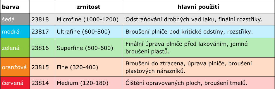 - Jednoduchý výběr zrnitosti: Barevné kódování eliminuje chyby při výběru. Rychle se tak orientujete od hrubého tvarování až po jemné dokončování.